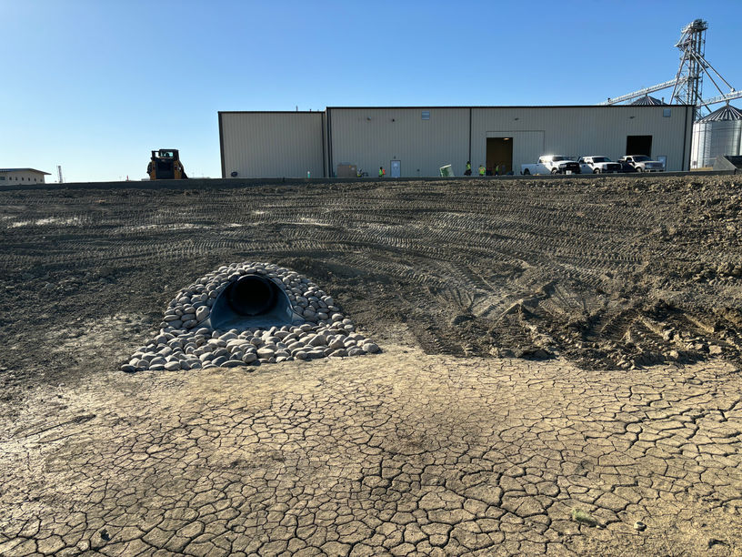 Extensive site work addressed the unique challenges posed by the existing soil conditions. The site underwent complete demolition of prior pavements and utilities. Challenging soil conditions were mitigated through a modified subgrade pavement design, incorporating geogrid reinforcement and additional aggregate base layers. Exterior concrete door locations were equipped with full-depth concrete footings and frost-protected stoops using void forms, while overhead door areas utilized polystyrene board insulation to counteract seasonal freeze-thaw effects. A storm sewer system manages runoff from parking areas and roof downspouts, routing water to an on-site detention basin. The project also includes a new pressurized septic system for wastewater treatment and water service is provided through Southwest Rural Water.